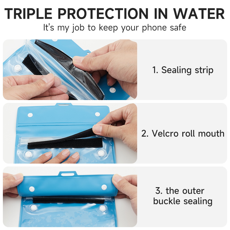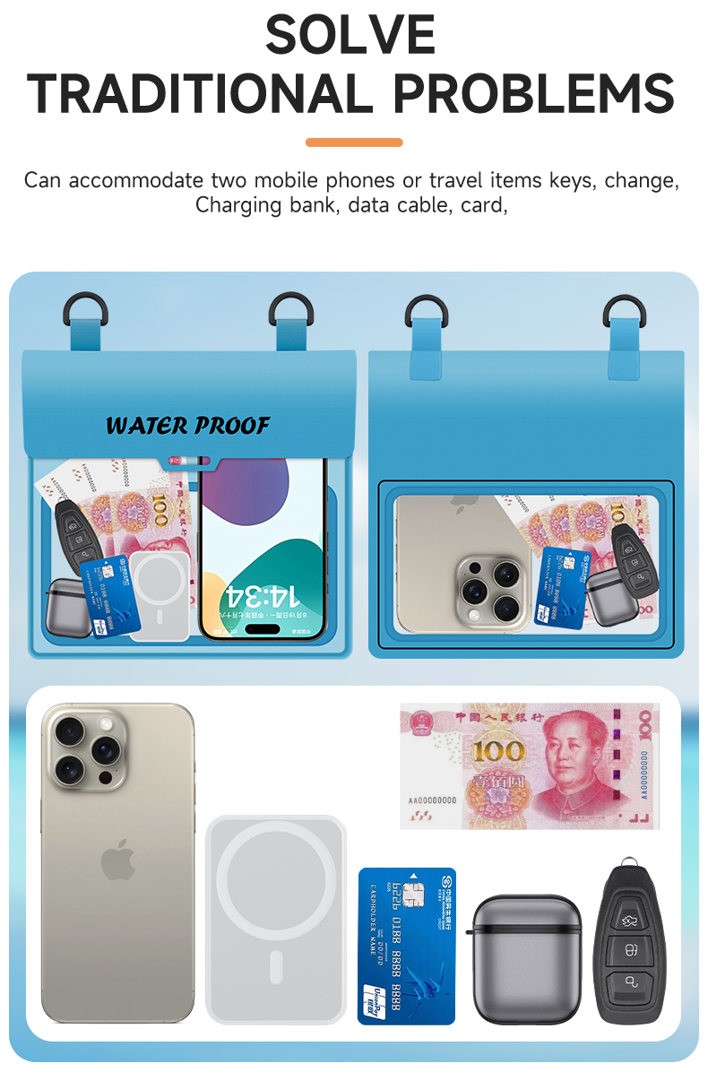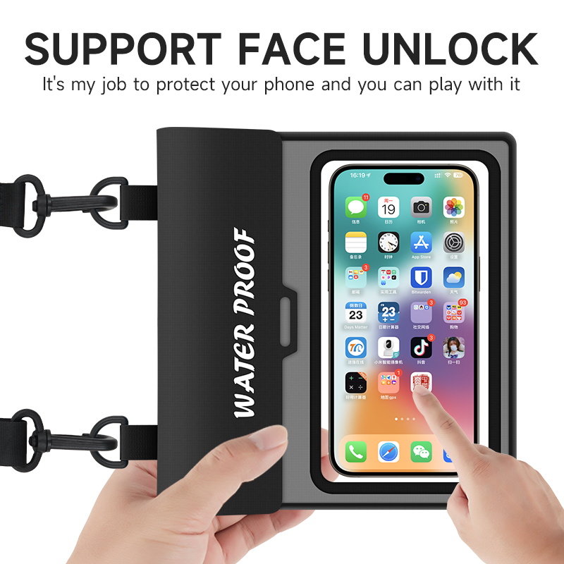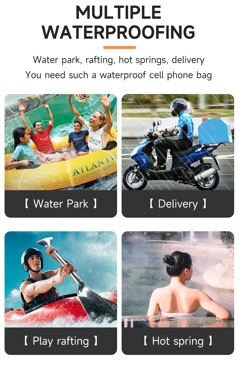 The cross-body waterproof phone bag is suitable for a wide range of scenarios, truly achieving "one bag for multiple uses." When vacationing by the sea, rafting, or snorkeling, wearing this crossbody waterproof phone bag frees your hands, allowing you to fully enjoy the waves and water activities. Its waterproof performance protects your phone and documents from getting wet, and the highly transparent window makes it easy to take photos underwater and capture beautiful moments. During rainy commutes or outdoor cycling, the close-fitting design prevents rainwater from seeping in, allowing you to easily scan QR codes for payments and check navigation, while also blocking sand and mud. When exercising or taking care of children, wearing it across your chest allows for easy access to your phone and storage of small items like keys and tissues, eliminating the need to constantly worry about your belongings. For daily grocery shopping or short trips, the lightweight and simple design complements any outfit, providing both splash protection and convenient storage for personal items, maximizing practicality.