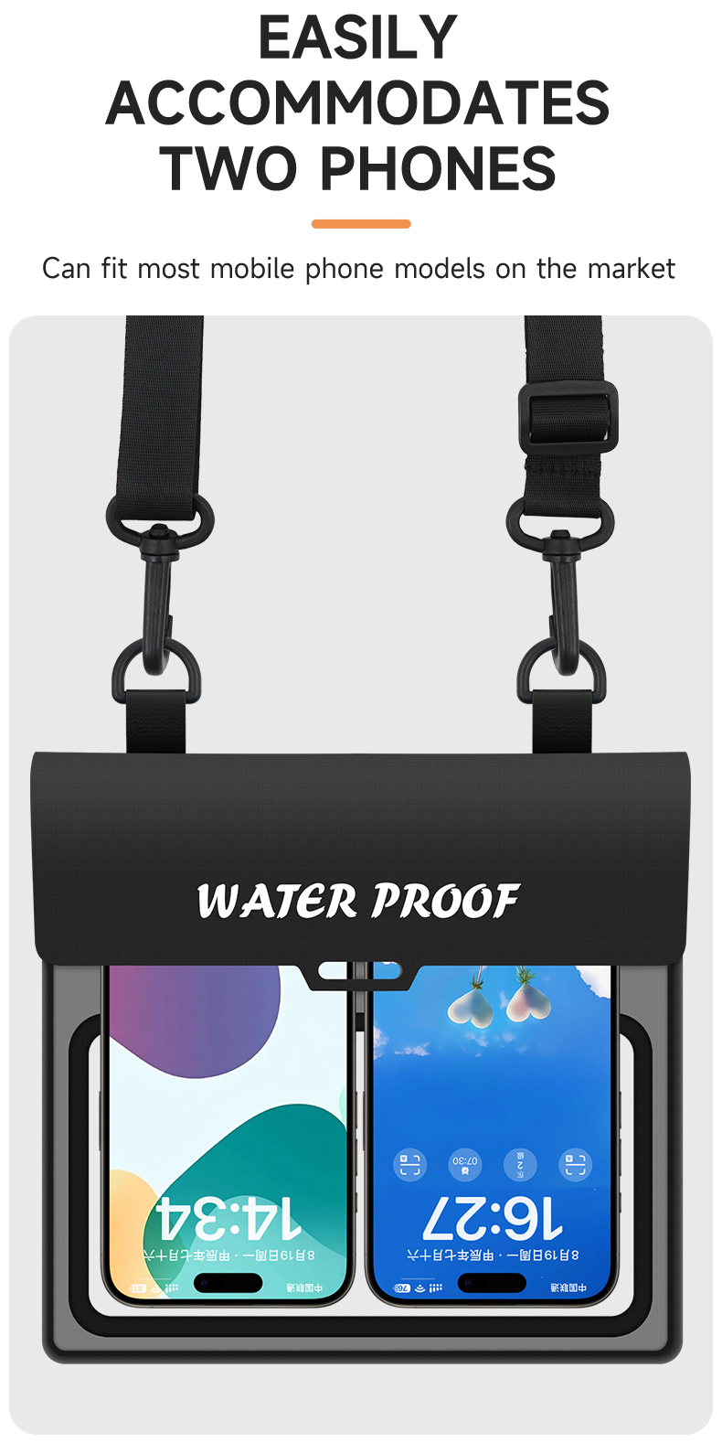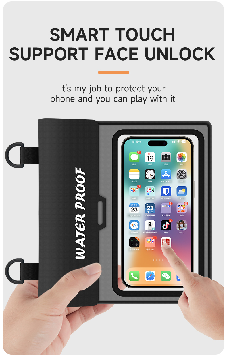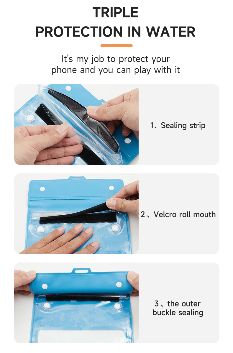 The cross-body waterproof phone bag is suitable for a wide range of scenarios, truly achieving "one bag for multiple uses." When vacationing by the sea, rafting, or snorkeling, wearing this crossbody waterproof phone bag frees your hands, allowing you to fully enjoy the waves and water activities. Its waterproof performance protects your phone and documents from getting wet, and the highly transparent window makes it easy to take photos underwater and capture beautiful moments. During rainy commutes or outdoor cycling, the close-fitting design prevents rainwater from seeping in, allowing you to easily scan QR codes for payments and check navigation, while also blocking sand and mud. When exercising or taking care of children, wearing it across your chest allows for easy access to your phone and storage of small items like keys and tissues, eliminating the need to constantly worry about your belongings. For daily grocery shopping or short trips, the lightweight and simple design complements any outfit, providing both splash protection and convenient storage for personal items, maximizing practicality.