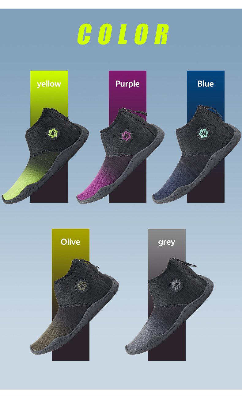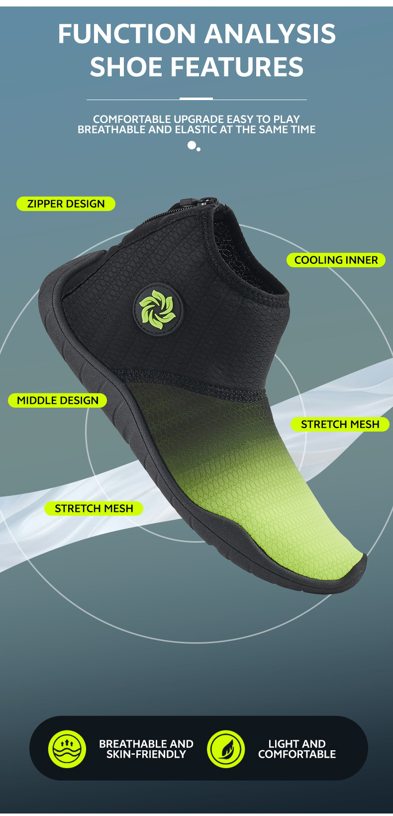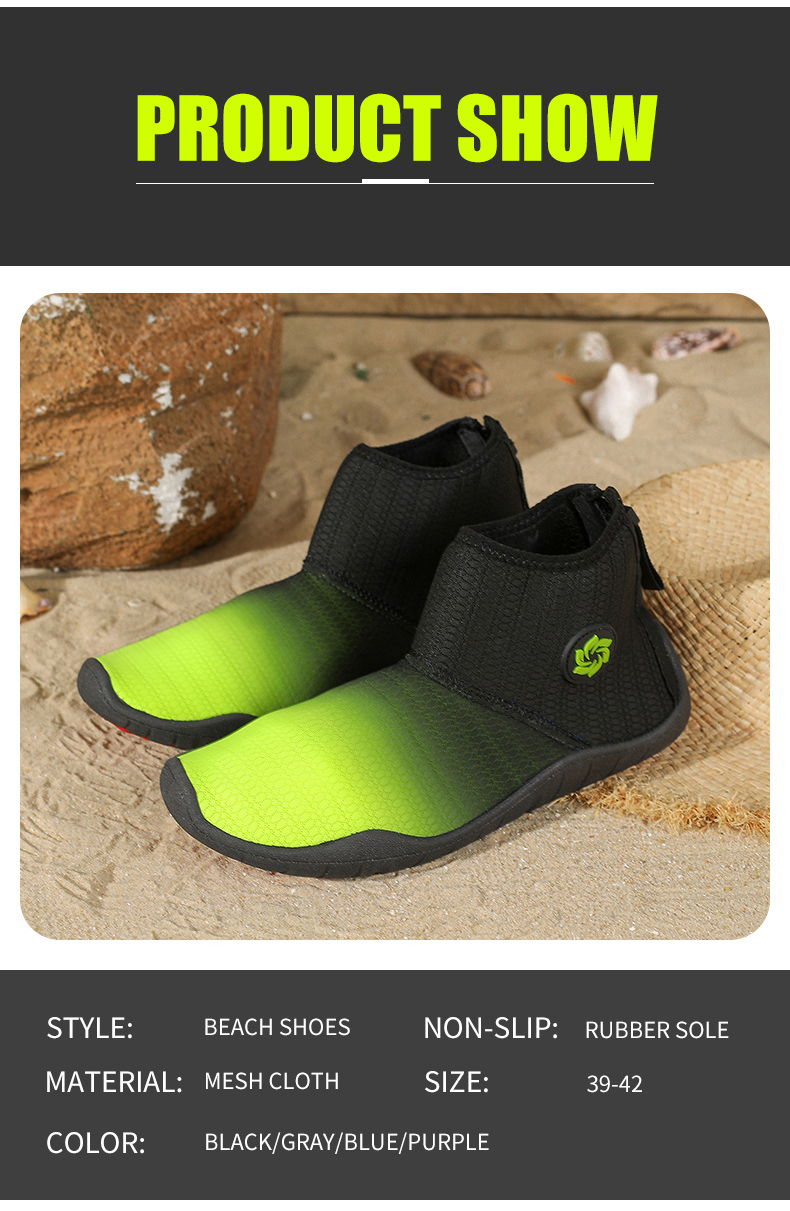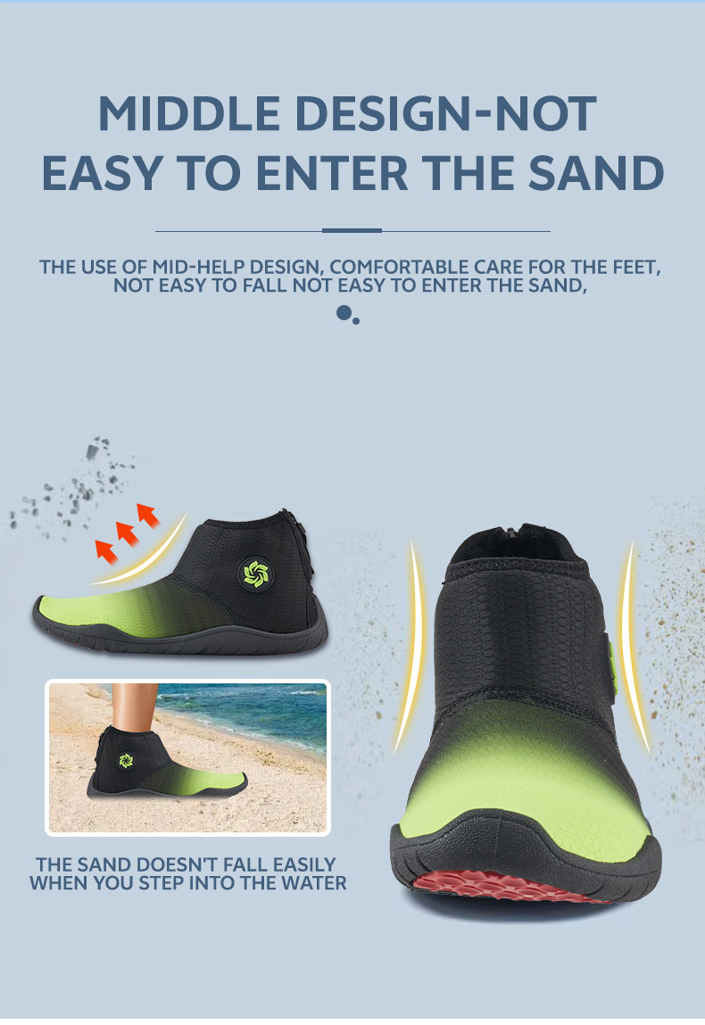 During use: Avoid stepping on sharp objects (even with hard-soled models), ensure the zippers on high-top models are fully closed to prevent sand/seawater from entering.