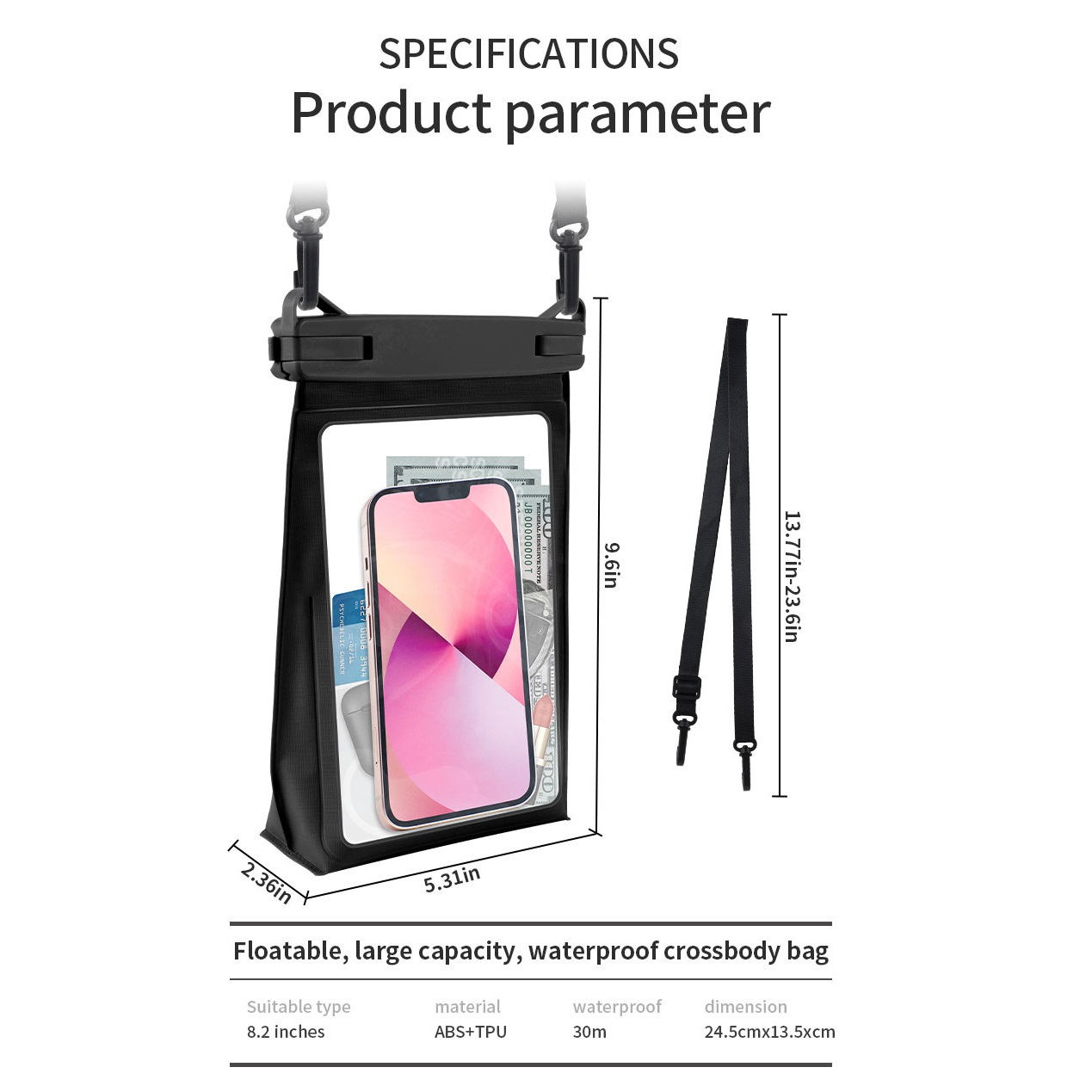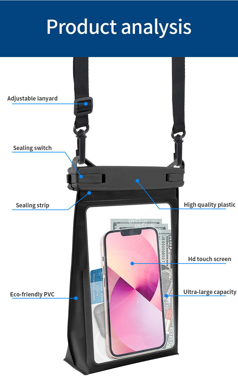 The scientific storage design allows the cross-body waterproof phone bag to achieve efficient organization within a limited space, balancing safety and convenience. The interior mostly uses a layered structure, equipped with an independent phone compartment, some with shock-absorbing foam lining to prevent the phone from being scratched by keys and other hard objects; mesh inner pockets can store small items such as keys and earphones, and the independent inner pocket on the flap is suitable for storing access cards, cash, and other frequently used items, easily accessible without searching. The capacity design is highly targeted; the everyday model (2-3L) can easily accommodate large-screen phones, keys, earphones, and other necessities without being bulky or taking up too much space; the outdoor model (around 5L) can additionally hold power banks, sunscreen, wet towels, etc., and some even have separate dry and wet compartments, with the main compartment storing valuables and the independent wet compartment storing swimwear and towels, avoiding odors and cross-contamination. Even more thoughtfully, the outside of the phone compartment often uses high-transparency TPU material, combined with a special conductive film, with a light transmittance of over 95%, allowing for smooth unlocking, typing, taking photos, and scanning without delay, eliminating the need to take out the phone for operation, greatly enhancing convenience.