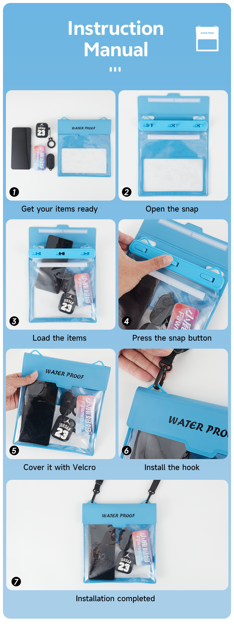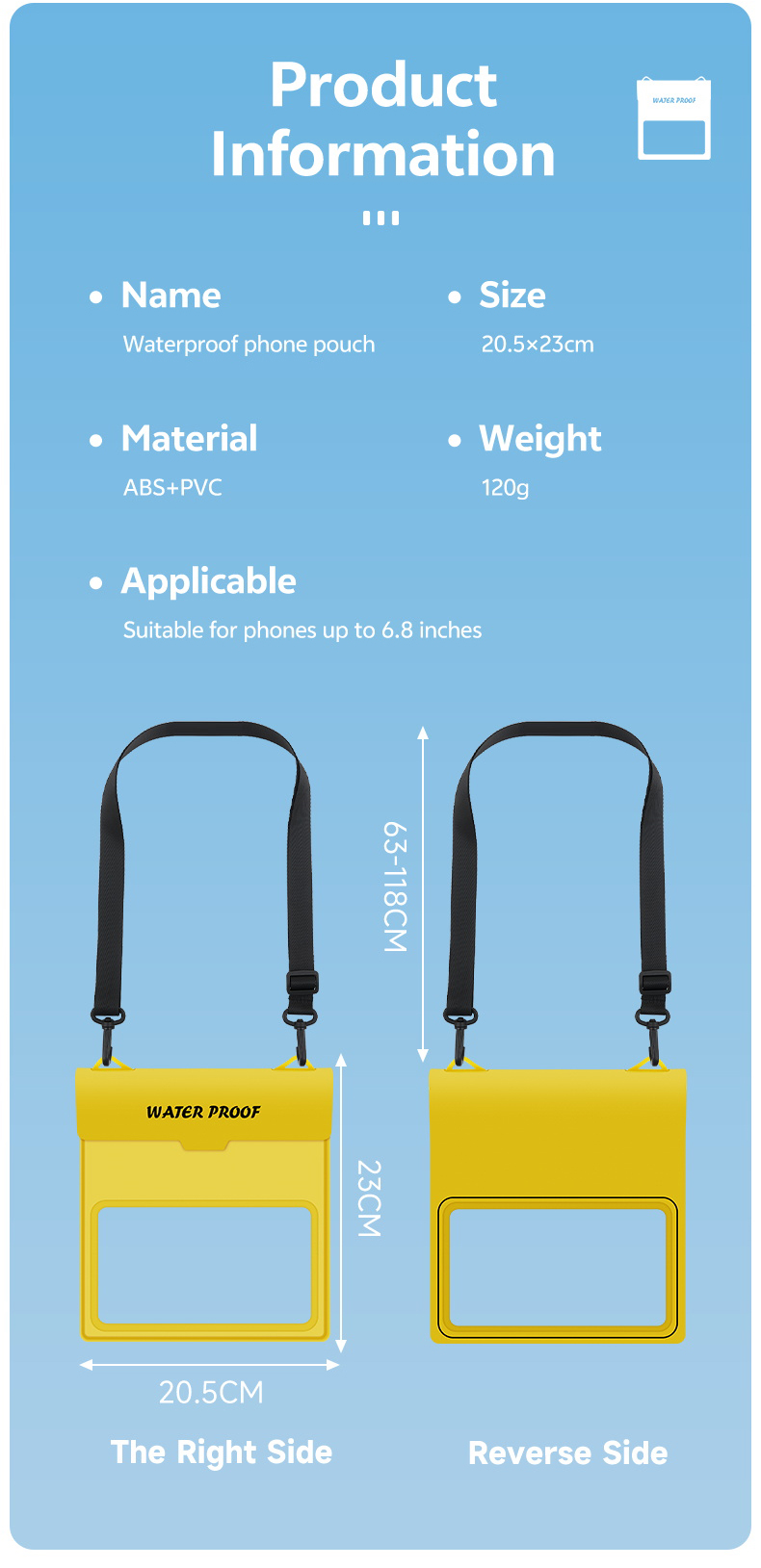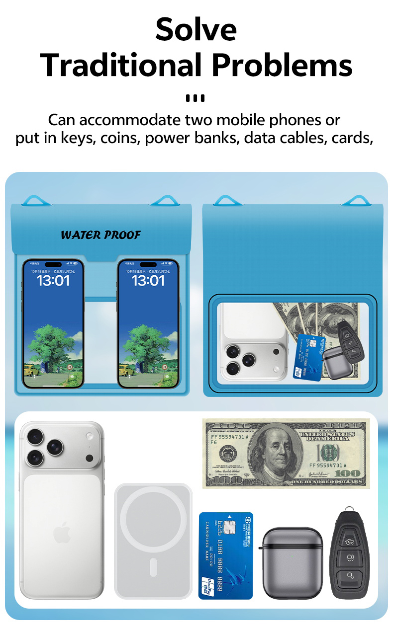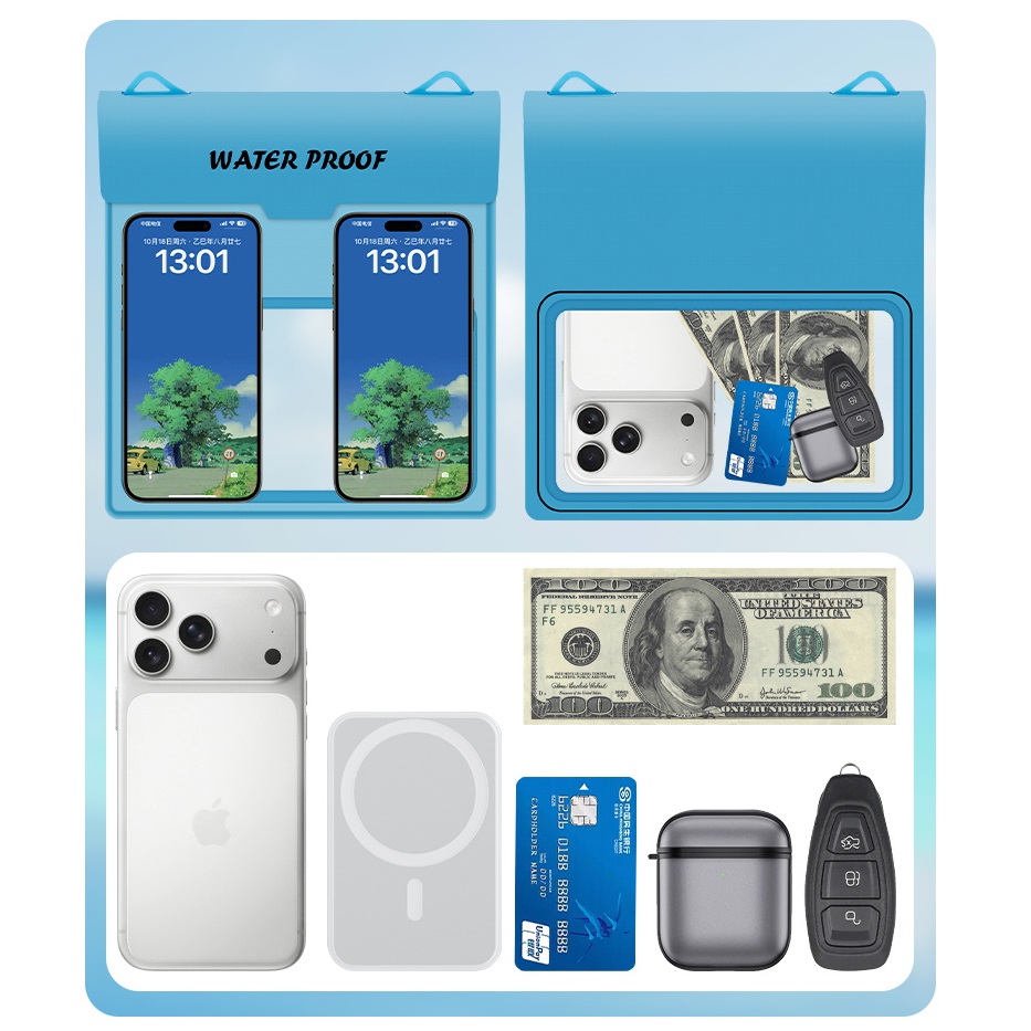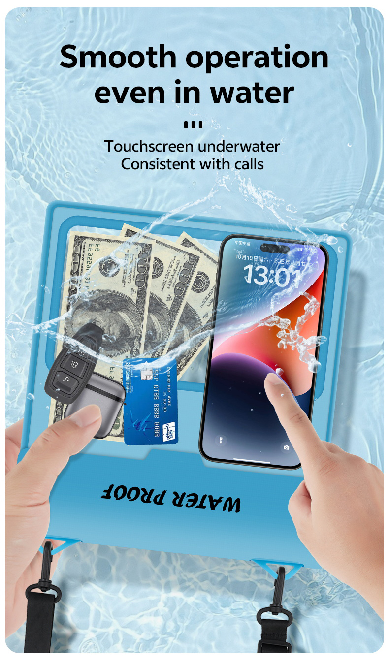 The waterproof phone pouch is a portable, sealed, and waterproof device specifically designed for mobile phones. Its core value lies in protecting your phone and small items from water in wet/damp environments (such as swimming, rafting, or commuting in the rain). Most models also support touchscreen operation, combining protection and practicality, making it an essential item for water activities and outdoor wet environments.